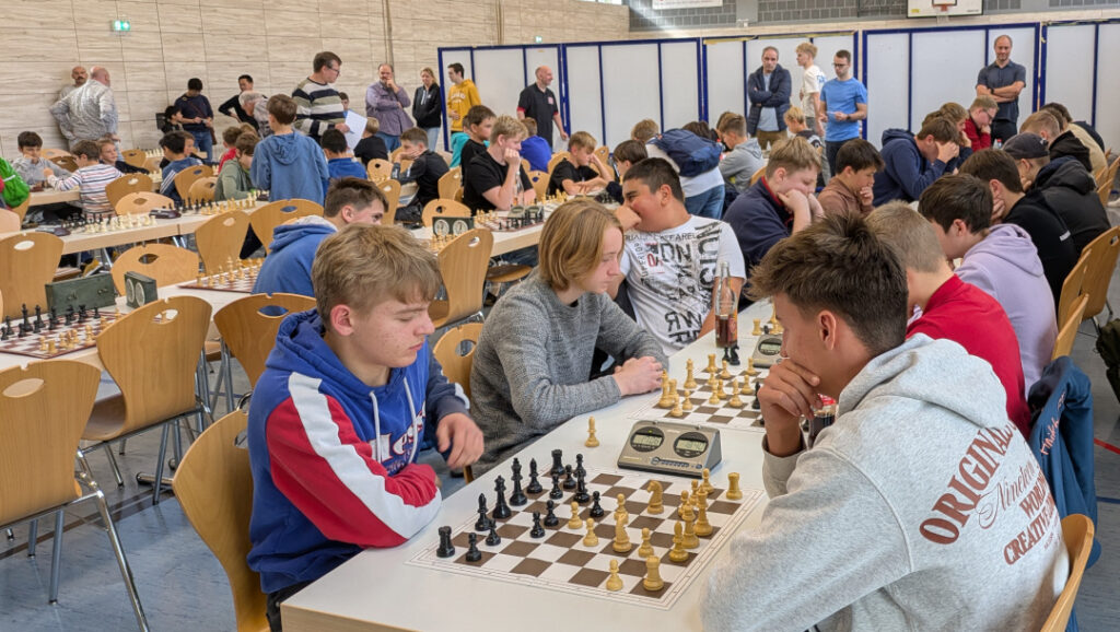 Am Sonntag, den 12.10.2025, richtete der SC Nusplingen den 1. Jugend-Grand-Prix der Saison 2025/2026 im Bezirk Alb/Schwarzwald aus. An diesem wunderschönen Herbsttag fanden sich insgesamt 18 teilnehmende Vereine in der Nusplinger Festhalle ein. Die meisten Teilnehmenden stellten dabei der SK Bebenhausen (13 Teilnehmende), SC Nusplingen (11), SV Stockenhausen-Frommern (8) und SC Hechingen (8). Die 83 Kinder und Jugendlichen wurden in sechs Altersgruppen (U8-18) eingeteilt. Um die GewinnerInnen der Altersklassen zu ermitteln, wurden sieben „Schnellschach“-Partien (engl. „rapid“) mit 20 Minuten Bedenkzeit pro SpielerIn gespielt. Im eingesetzten Spielmodus, dem Schweizer-System, wurden die jeweils Punktbesten gegeneinander gelost, sodass sich am Ende ein klarer Sieger bzw. eine klare SiegerIn herauskristallisierte. Bei Punktgleichheit entschied dann die Buchholzwertung, welche die addierten Punkte der eigenen Gegner repräsentiert.