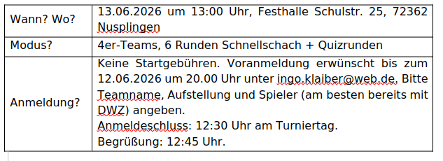 um das 50-jährige Bestehen und die Schönheit des Schachspiels zu zelebrieren, veranstaltet der SC Nusplingen am 13.06.26 zusätzlich auch ein Laienturnier. Das Turnier wird genauso umgesetzt, wie das Turnier für die Schachvereine. Die Teams bestehen aus zwei Personen (Ersatzspieler:innen möglich). Insgesamt werden sechs Runden mit einer Bedenkzeit von etwa 10 Minuten (+2 Sek./Zug) gespielt. Es wird lediglich vorausgesetzt, dass man weiß, wie die Figuren fahren und wie man Matt setzen kann. Den König zu schlagen ist nicht erlaubt.